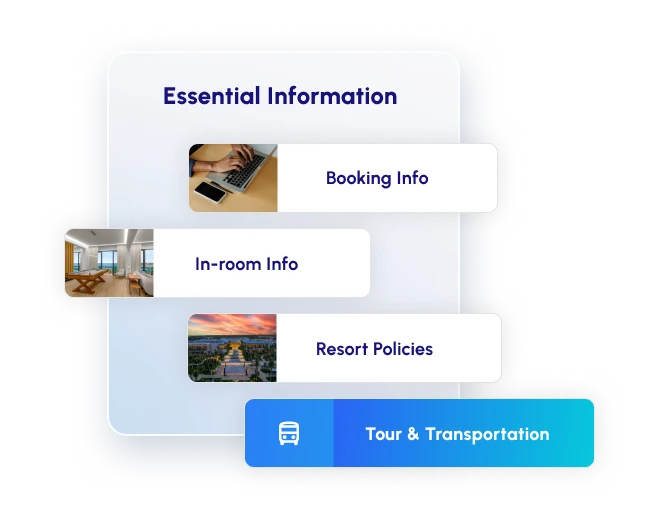 Los huéspedes pueden acceder fácilmente a información esencial como detalles de check-in/check-out, directorios del hotel, mapas, normas y opciones de transporte desde/hacia el aeropuerto, mejorando así su experiencia general.